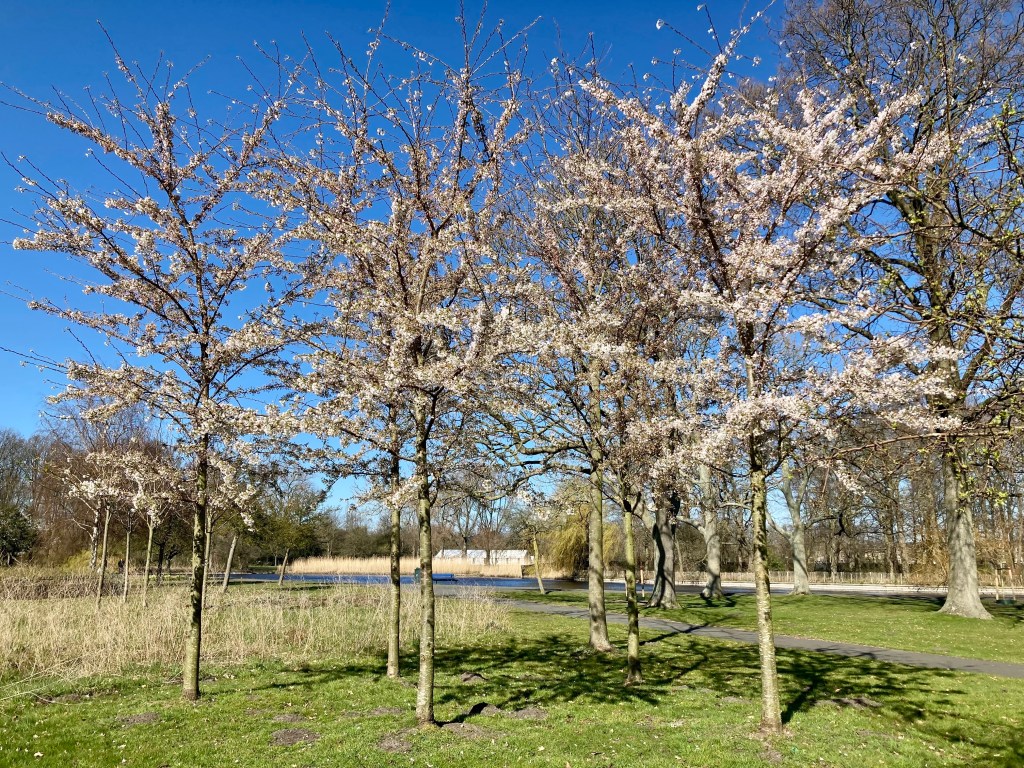 En op 19 maart was het helemaal genieten: wat een lekker weer was het! Het zonnetje scheen volop. Net als hardlopen is buiten zijn trouwens ook goed voor je mentale en fysieke gezondheid, en als de zon schijnt helpt dat helemaal bij je humeur. Net terug van vakantie uit de Alpen, waar het ‘s morgens nog erg fris kon zijn, had ik een hardlooptrui aangetrokken, maar dat bleek veel te warm te zijn! Links en rechts kwamen er andere hardlopers voorbij in korte broeken en t-shirts met korte mouwen. De lente hing echt in de lucht! In het park stonden ook overal bomen en struiken in bloei.
