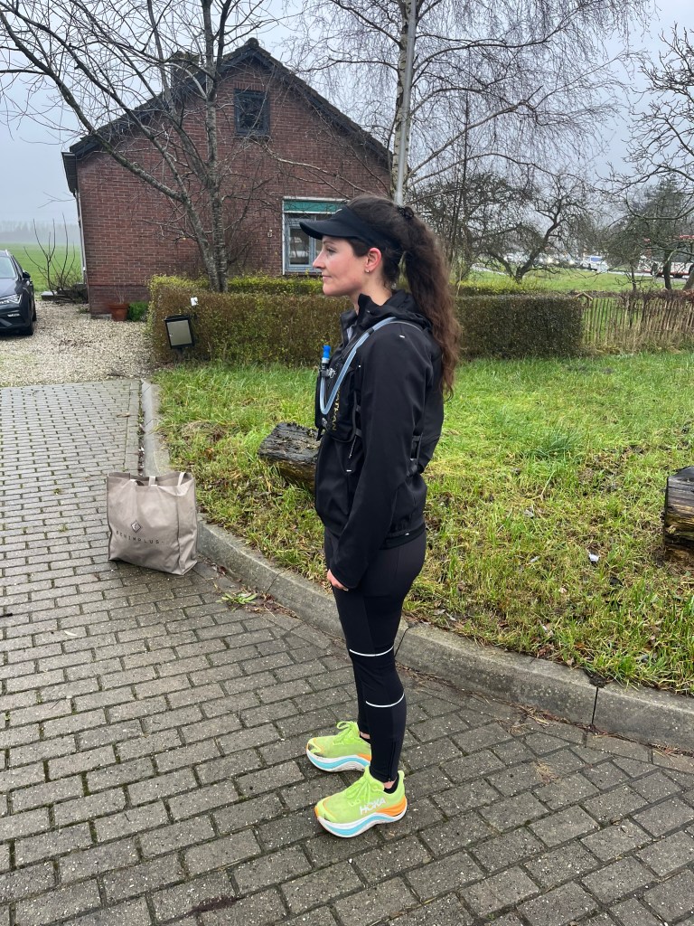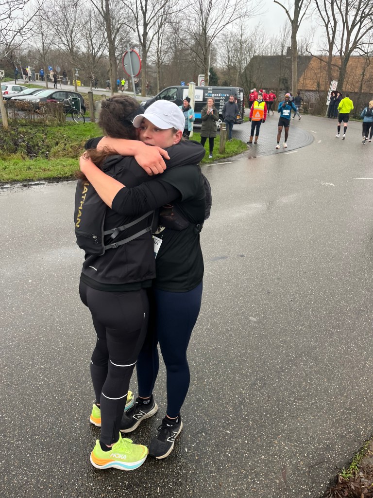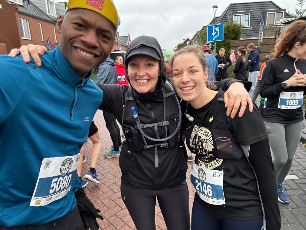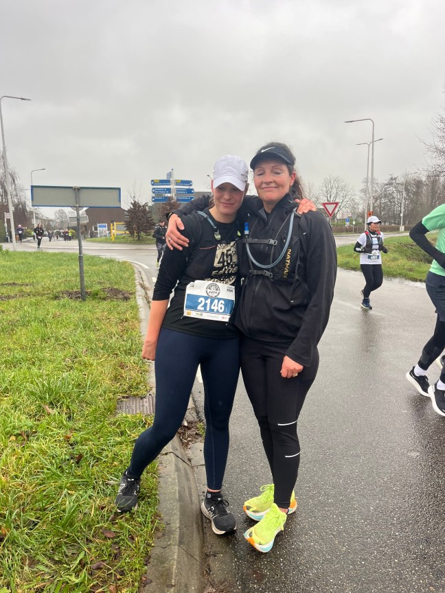Al grappend dat we nog nooit zo ver waren gekomen in deze race en dat alle kilometers na dit punt winst waren, vervolgden we onze weg. We renden uiteraard niet met het doel om een goede tijd neer te zetten, maar dankzij Davy als pacer liepen we toch op een voor Elsa en mij uitdagend tempo. Het was best pittig om dat vol te houden door de harde wind en regen. “Holland waterland”, ging het door mijn hoofd terwijl we plassen op de weg probeerden te ontwijken en over dijken langs sloten en kanalen en zompige weilanden renden. Af en toe passeerden we fraaie dorpjes in kerstsfeer, waar supporters ons langs de kant aanmoedigden. Ik maakte dankbaar gebruik van het fruit dat we onderweg aangeboden kregen: ik had de energie hard nodig!