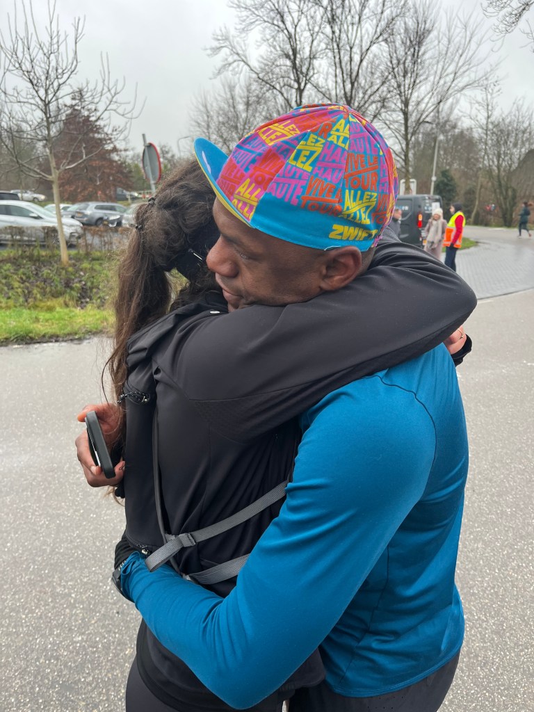 Hoe fijn was het om daarna in de armen van mijn moeder te kunnen vallen die ons aan de finish in de regen en kou stond op te wachten. Mijn moeder is er zo voor mij geweest het afgelopen jaar. Toen ik in het ziekenhuis lag is ze al die tijd bij mij gebleven en nadat ik uit het ziekenhuis werd ontslagen kon ik bij haar thuis verblijven, omdat het door mijn letsel voor mij onmogelijk was om naar mijn eigen huis en gezin te gaan. Herinneringen aan al die momenten schoten door mijn hoofd toen ik rillend van de uitputting en de kou mijn moeders warme omhelzing voelde.